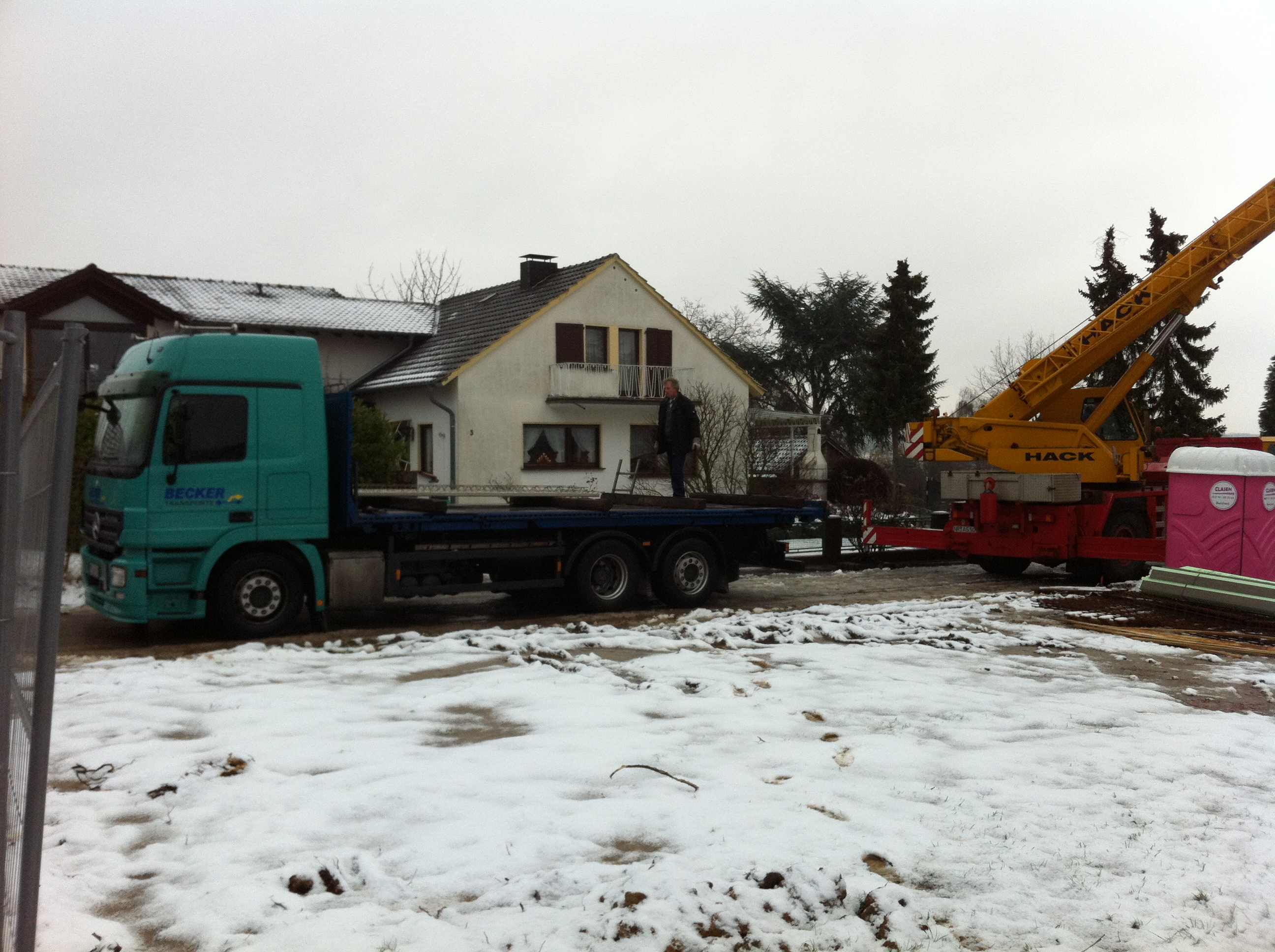 Trotz widriger Wetterbedingungen gingen die Arbeiten an unserem Haus heute in vollem Gange weiter. Über Nacht hatte es geschneit. Bei uns in Remscheid an die 20 cm, in Villiprott immerhin noch gut 5 cm, so dass die für heute avisierte Lieferung der Betonelemente für die Geschossdecke im Obergeschoss ernsthaft gefährdet erschien. In der Tat gestaltete sich die Anfahrt als schwierig da der Rodder Kirchweg noch nicht geräumt war, hier musste unser Bauleiter Herr Walheim erst mit zwei Säcken Streusalz nachhelfen, bevor der Tieflader mit den Betonelementen gefahrlos den letzten Abschnitt zur Baustelle bewältigen konnte. Aufgrund der äußeren Bedingungen mussten der Sattelschlepper mit dem Tieflader und der Autokran auf der Straße platziert werden, das Nachbargrundstück, auf dem bislang schweres Gerät immer seinen Platz gefunden hat, war durch die Regen- und Schneefälle zu sehr aufgeweicht.