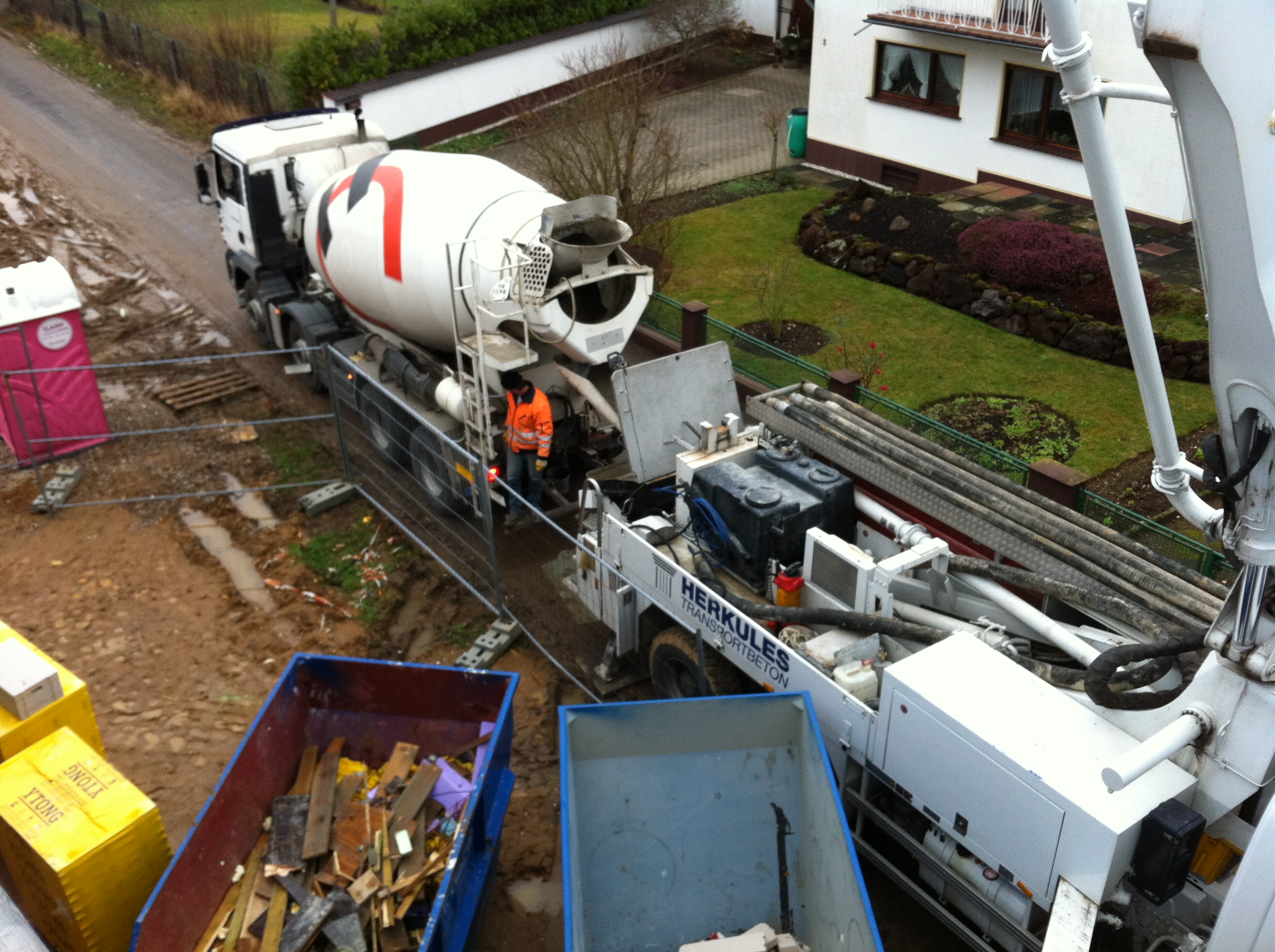 Bei einigermaßen trockenem Wetter konnte gestern die Geschossdecke des Obergeschosses mit Beton ausgegossen werden, die Zugleich unser Flachdach bildet. Ursprünglich für 11:00 Uhr bestellt, kamen die drei Betonmischer deutlich verspätet gegen 14:30 Uhr an der Baustelle an. Kurz vor Einbruch der Dunkelheit waren die Decke dann fertig. Damit ist der Rohbau fast vollständig fertiggestellt. Zwischen den Tagen wird Michael Kempe noch die Attika mauern, damit der Dachdecker die Dachisolierung einmessen kann. Im neuen Jahr werden dann noch die übrigen nicht tragenden Mauern im Erd- und Obergeschoss gemauert, womit der Rohbau dann komplett ist.