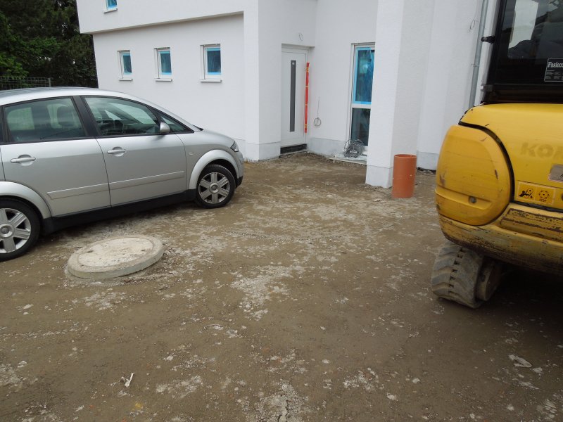 Da zuvor noch ein Planum für die Bodenplatte und die Zuwegung zur Garage geschaffen werden muss, setzten wir uns also kurzfristig mit Herrn Moll in Verbindung, der die Ausführung (noch einmal vielen Dank!!!) kurzerhand für den nächsten Tag in seine Planung aufgenommen hat.