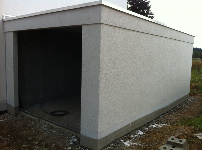 Nachdem am Samstag der Grundputz aufgebracht wurde, konnte Herr Fiebig heute bereits den 3mm Scheibenputz analog zu Hausfassade auf die Garage aufbringen. Die Putzarbeiten sind damit vollständig ausgeführt.